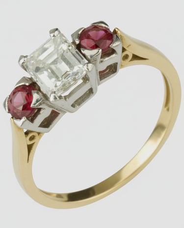 This ring is crafted in 18ct yellow gold with stones set in 18ct white gold. The stones are a 0.60ct diamond and 2 x 3mm Siamese rubies