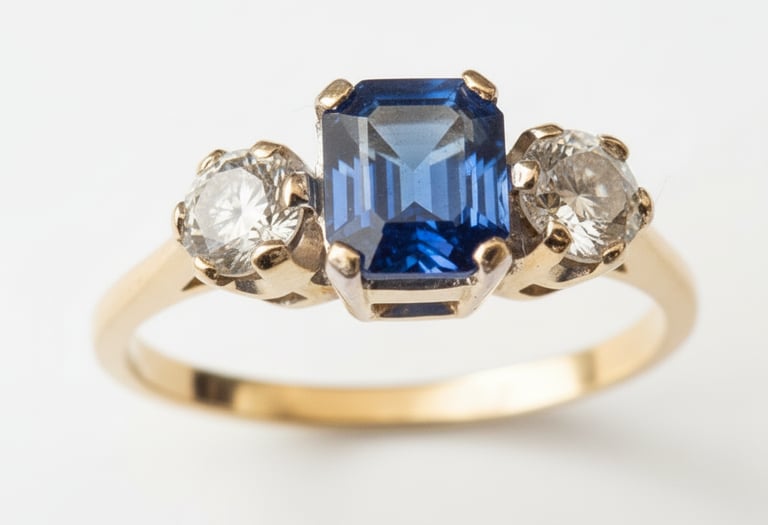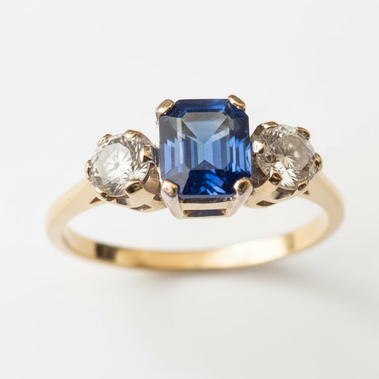 This ring is in 18ct gold with a 1.14ct emerald-cut Kanchan sapphire and two 0.24ct brilliant-cut diamonds