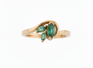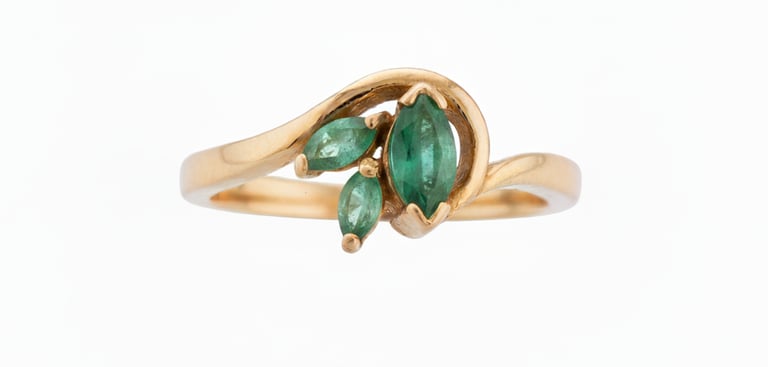 This ring is set with 0.54ct of marquise-cut emeralds. The stones were not perfect in colour or clarity, which made them comparatively inexpensive. They are set in 9ct gold rather than 18ct.