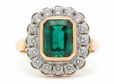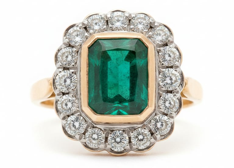 This ring is in 18ct yellow gold with stones set in 18ct white gold. The stones are a 1.83ct emerald and 16 x 2.1mm brilliant-cut diamonds