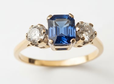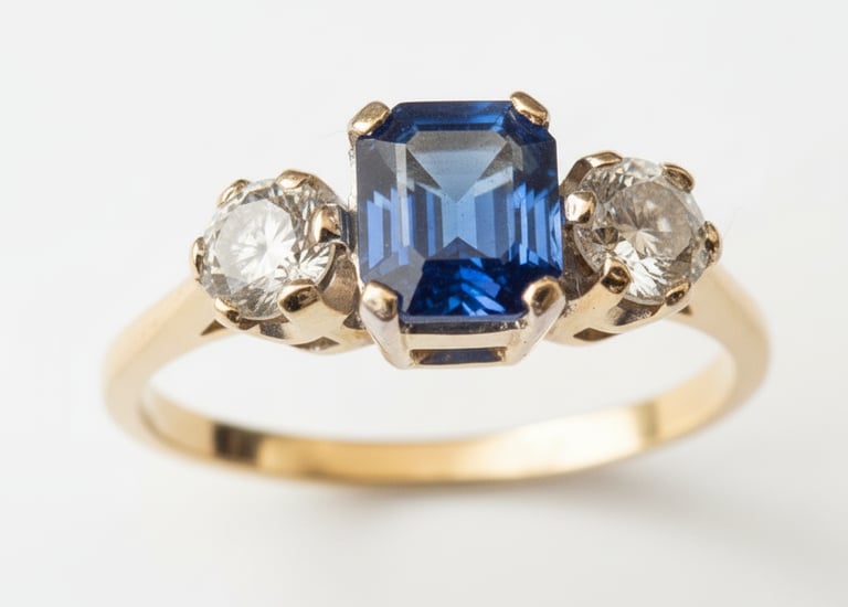 This ring is in 18ct gold with a 1.14ct emerald-cut Kanchan sapphire and two 0.24ct brilliant-cut diamonds
