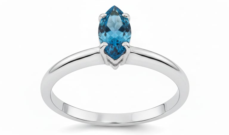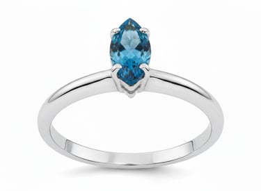 This ring may look like sapphire but the stone is actually a much less expensive 0.3ct marquise-cut London blue topaz. It is set in 9ct white gold.