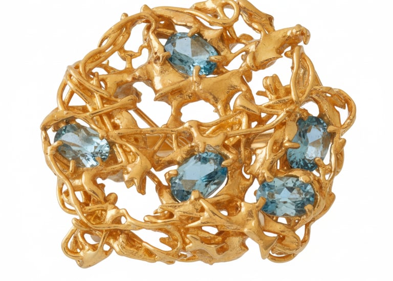 This unusual piece was made from off-cuts of pure 24ct gold wire left over from the wiring on the lunar lander built in 1968. The wire was provided by the customer who had worked on the Apollo programme at the time. It is set with five topaz stones in slightly different shades of blue. 18ct gold fittings were used on the brooch because 24ct gold would have been too soft for normal wear.