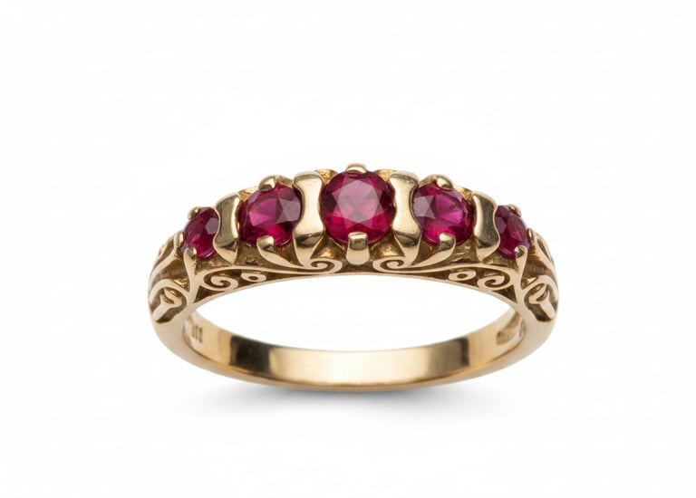 This ring is in 18ct gold set with a graduated set of Saimese rubies totalling 0.75ct