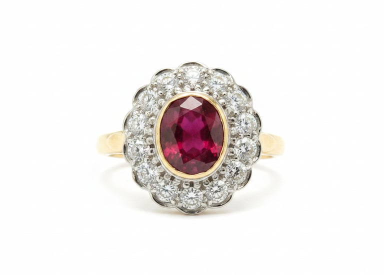 This ring is crafted in 18ct yellow gold with stones set in 18ct white gold. The stones are a 1.76ct oval-cut ruby and 14 x 2mm brilliant-cut diamonds